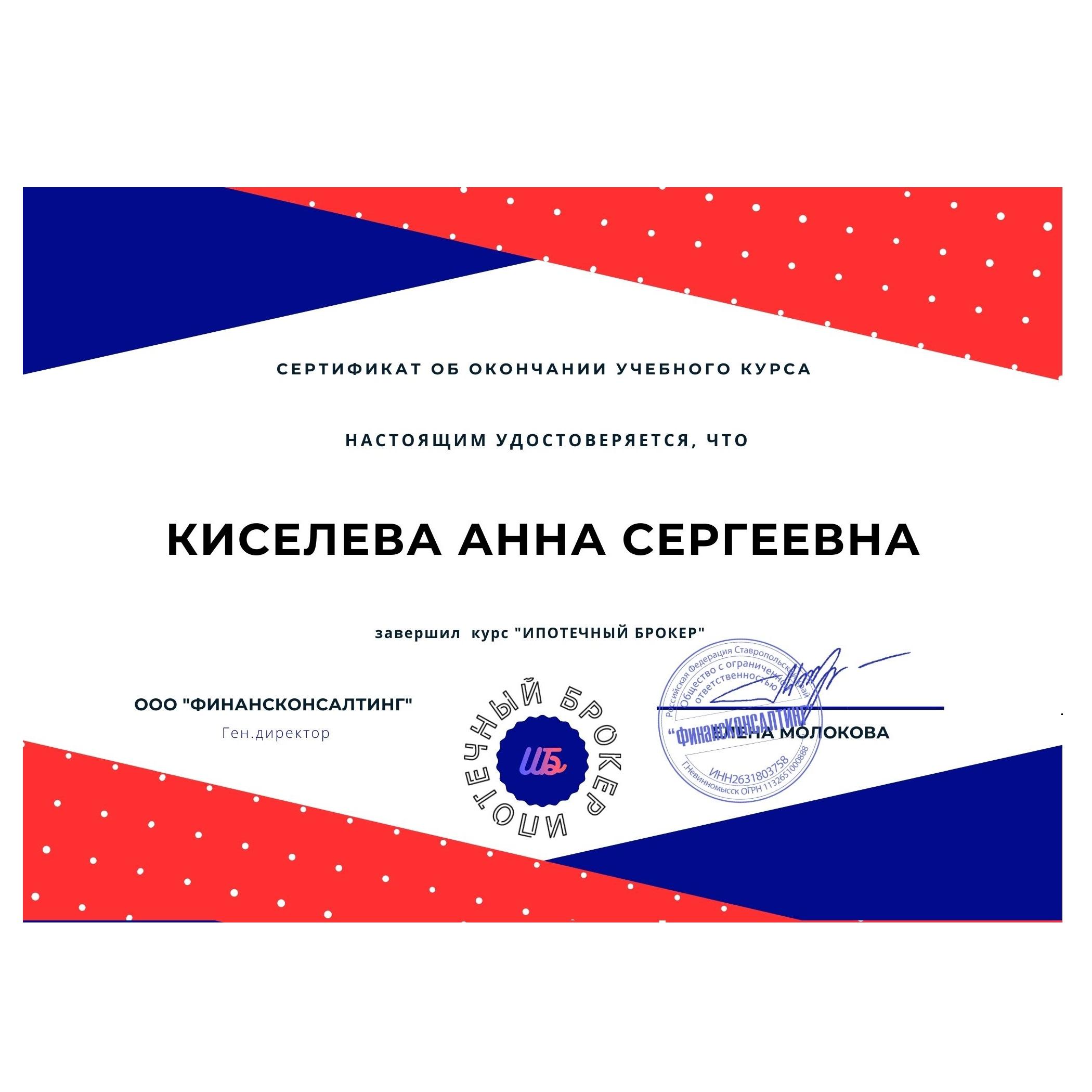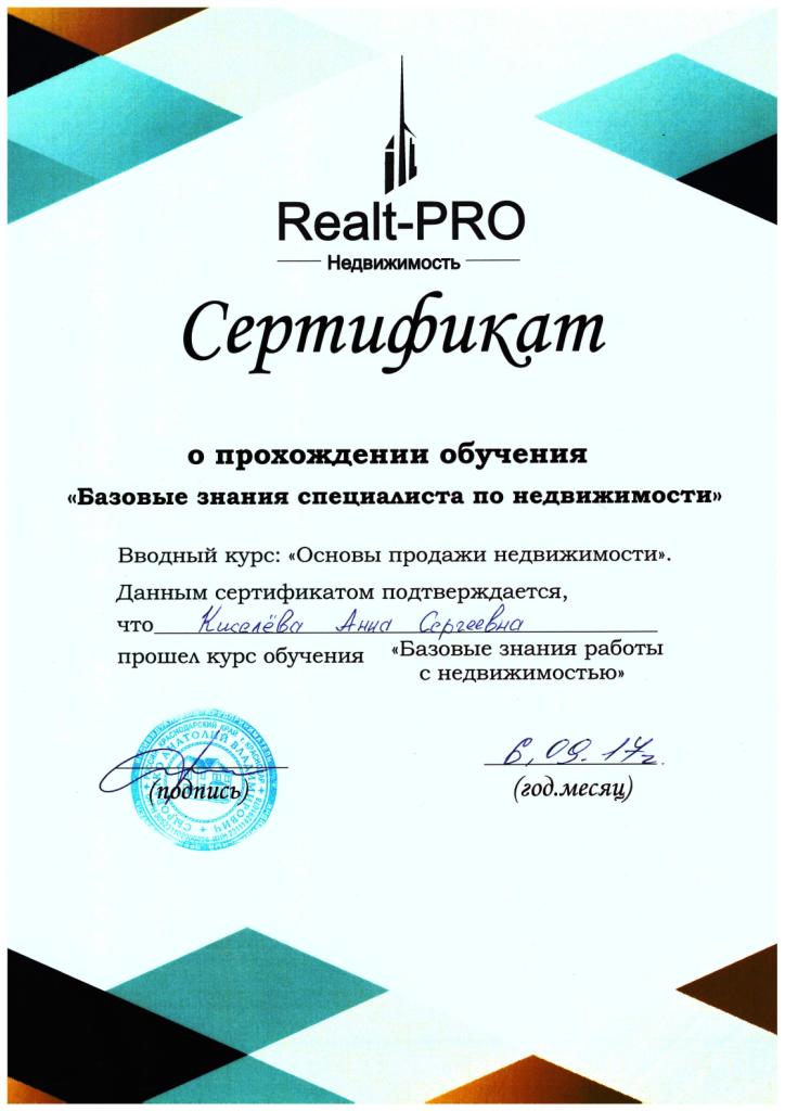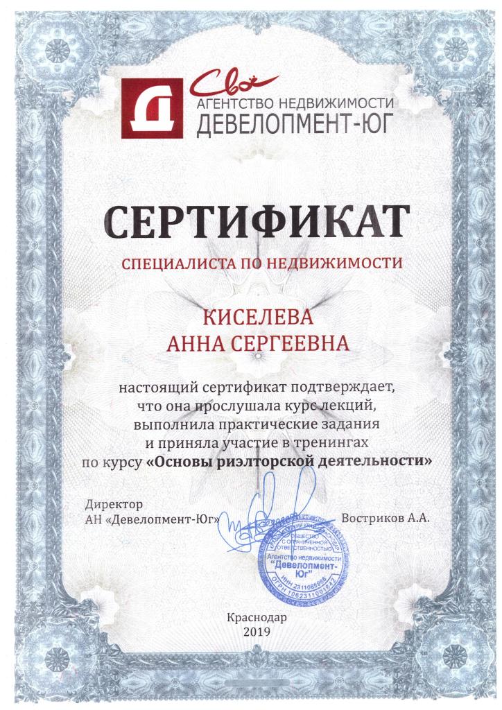 Выражаю огромную благодарность Киселевой Анне за помощь в покупке квартиры, начиная с ее выбора и заканчивая подписанием документов, за этот огромный труд! Думала, никогда не сделаю этого, но мне порекомендовали Анну.